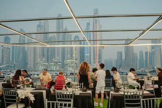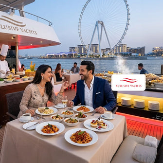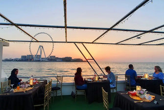 Enjoy a luxury Dubai Marina dinner cruise with buffet, drinks, and live music.